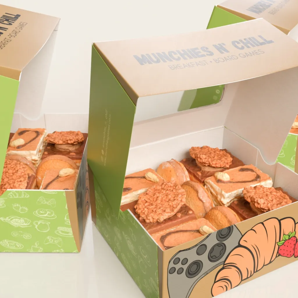 Pastikan kotak mudah dibuka dan ditutup, sesuai untuk display, dan stabil ketika dihantar. Bagi pastry yang lembut, struktur kotak perlu menyokong bentuk asal produk.